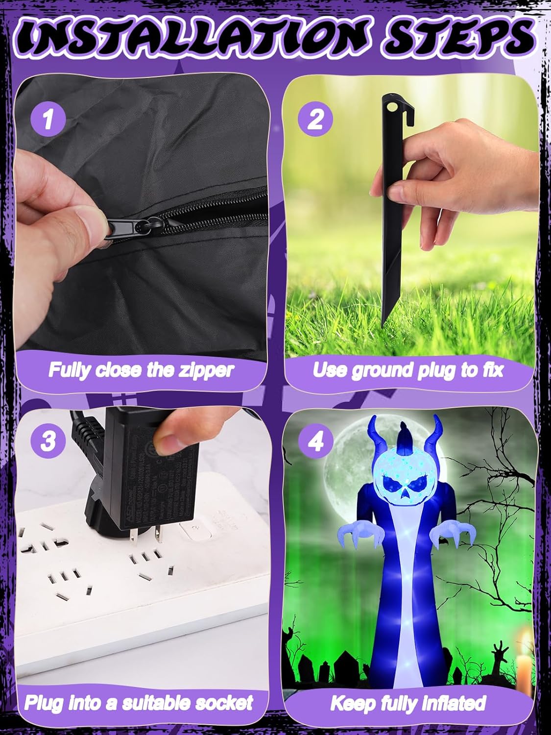 - 【Easy to Install】The blower with a power cord which meaning that you can place it anywhere in your yard or garden. First to inflate the Halloween inflatable decoration until there is enough air inside. Then fix the inflatable decoration by stakes and make sure it is secured on the ground. TIPS: do not put anything into the blower and decorations.