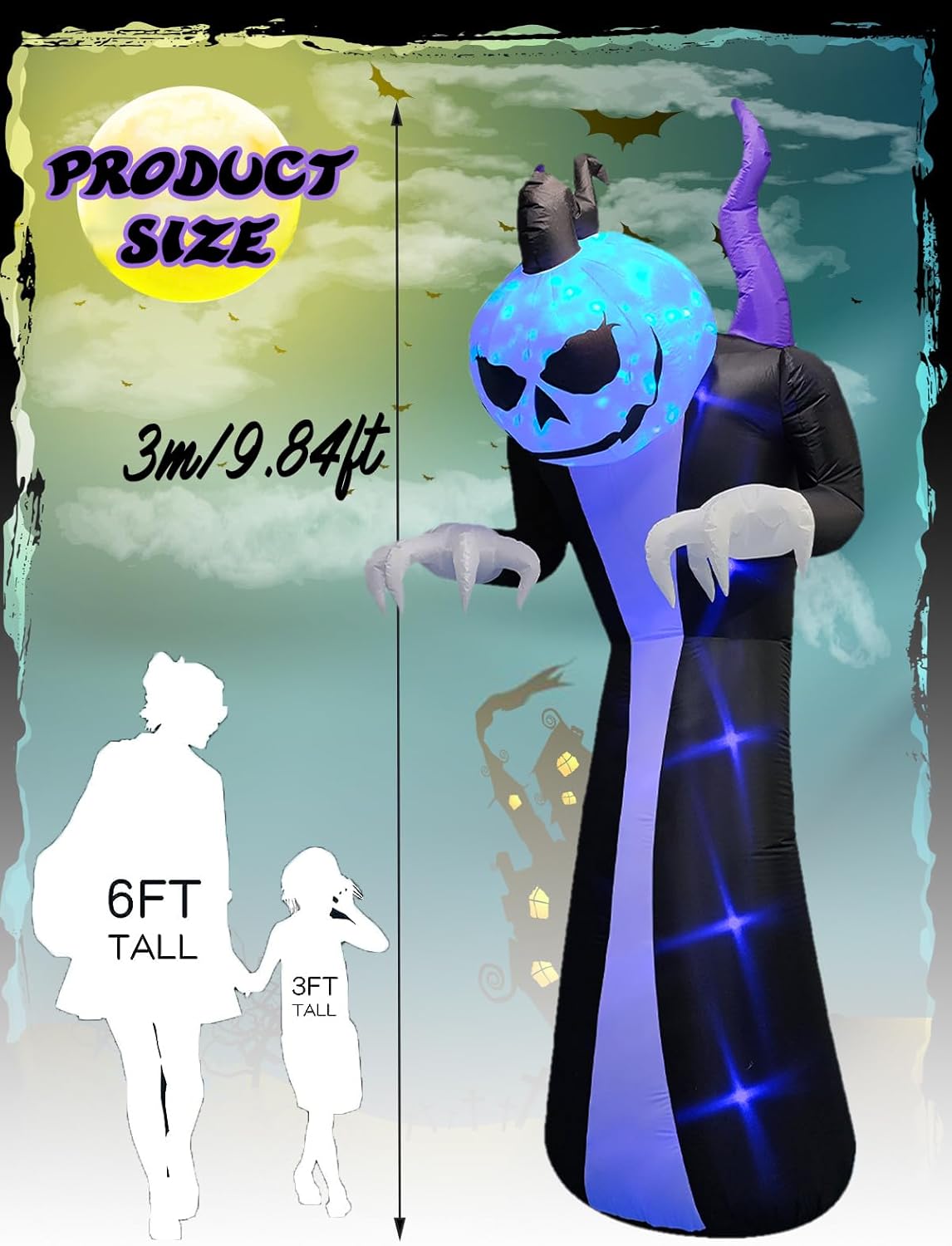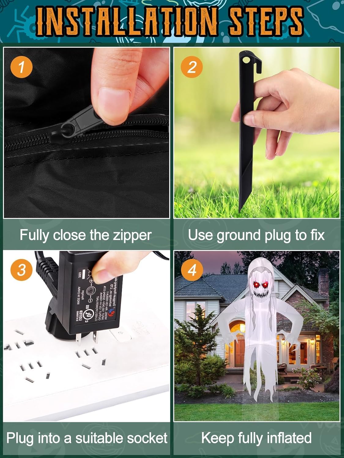 - 【10FT/3M Halloween Inflatable】Inflatables scary ghost with 3pcs plastic piles, 3pcs ropes, and 3pcs metal buckles. Installed in the yard, it will make your yard full of horror and interesting atmosphere during Halloween.